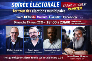 🗳️📺⚡ Soirée électorale municipales 2026 : Totale Impro 2.0 réunit les trois grands journalistes du Grand Sud-Ouest Parisien 📣 Par Jean-Pierre Morvan, animateur et fondateur de GSO Parisien News ▪️ Ce dimanche 15 mars 2026, entre 18h00 et 23h59, Totale Impro 2.0 organise une soirée électorale exceptionnelle pour le premier tour des élections municipales. Pour la première fois dans l’histoire de notre chaîne de streaming, nous accueillerons simultanément les trois journalistes majeurs des départements du Grand Sud-Ouest Parisien : Michel Seimando (78actu), Teddy Vaury (Le Républicain de l’Essonne) et Emmanuel Senecharles (Le28.tv). Cette soirée marathon constitue un moment clé des…