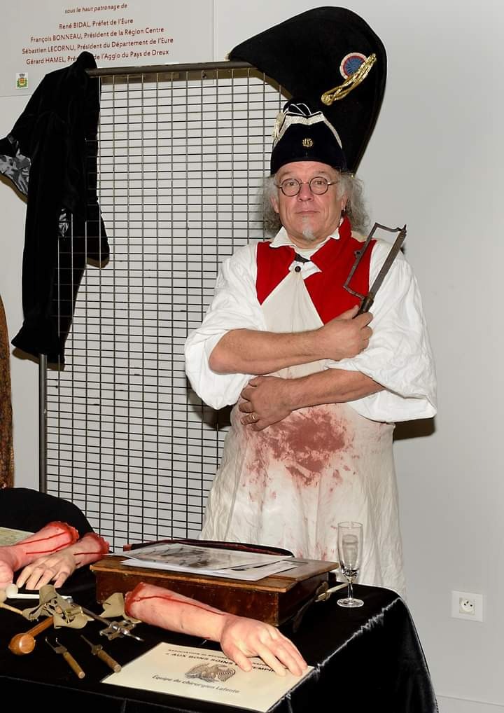 Cette année, le thème était, vous l’aurez tous compris, l’époque napoléonienne et son faste merveilleux ! Nous étions donc, hier, près d’une quarantaine d’auteurs contemporains – téléportés par la magie historique – au cœur du Premier Empire par la grâce des figurants de l’association « Aux Portes de l’Histoire ». Pas de mannequins, que nenni ! Mais des femmes et des hommes en uniformes d’époque et pour ces guerriers d’antan, un armement ad-hoc. Certains confrères, auteurs des deux sexes, avaient également endossé des costumes d’époque. La famille impériale était présente. L’Empereur, Napoléon Premier, était entouré d’officiers supérieurs de son état-major et de très belles dames de la Cour. Des figurants de talent majestueusement vêtus. Le baron Dominique-Jean Larrey, médecin et chirurgien en chef de l’Empire, père de la médecine d’urgence, était à l’œuvre. Entre deux amputations, scie en main, manière de nous rappeler que la chirurgie militaire à cette époque ne fut pas un long fleuve tranquille, cet éminent praticien est venu au contact du public et des auteurs présents.