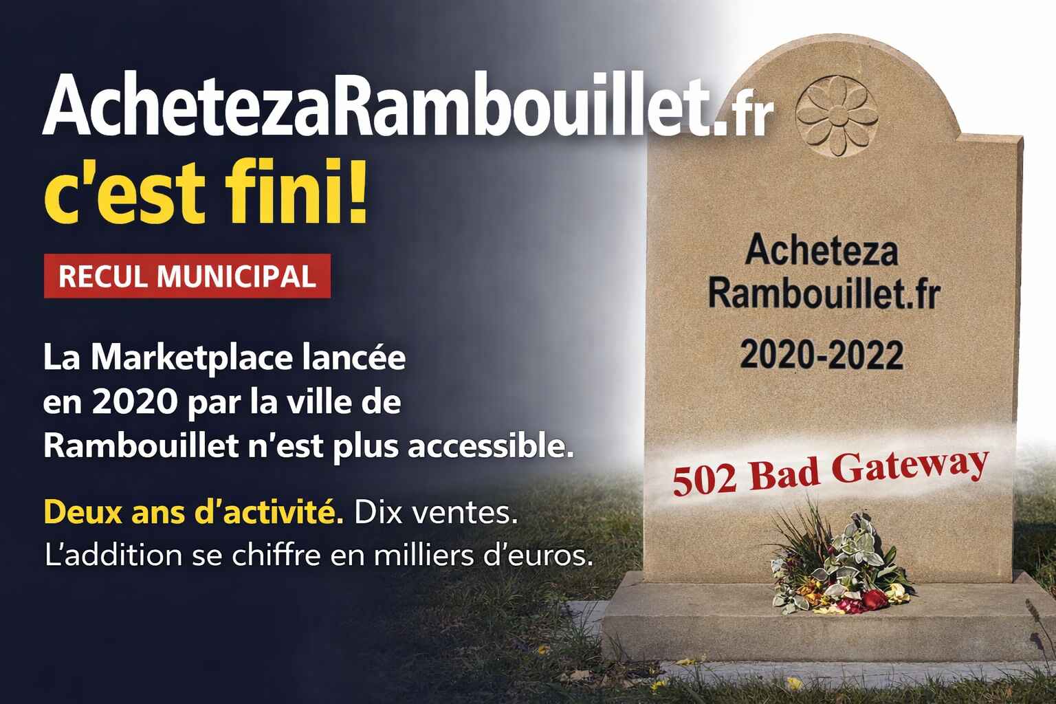 La Marketplace lancée à grands renforts de communication en 2020 par la ville de Rambouillet n’est plus accessible. A l’heure où j’écris ces lignes, l’adresse Url renvoie le message “502 Bad Gateway”. Cela fait déjà plusieurs mois, ce n’est pas bon signe. Le site de vente en ligne dédié aux commerces Rambolitains a probablement tiré définitivement et discrètement sa révérence, même si d’une façon paradoxale la ville continue à en faire encore la promotion sur son site Internet.