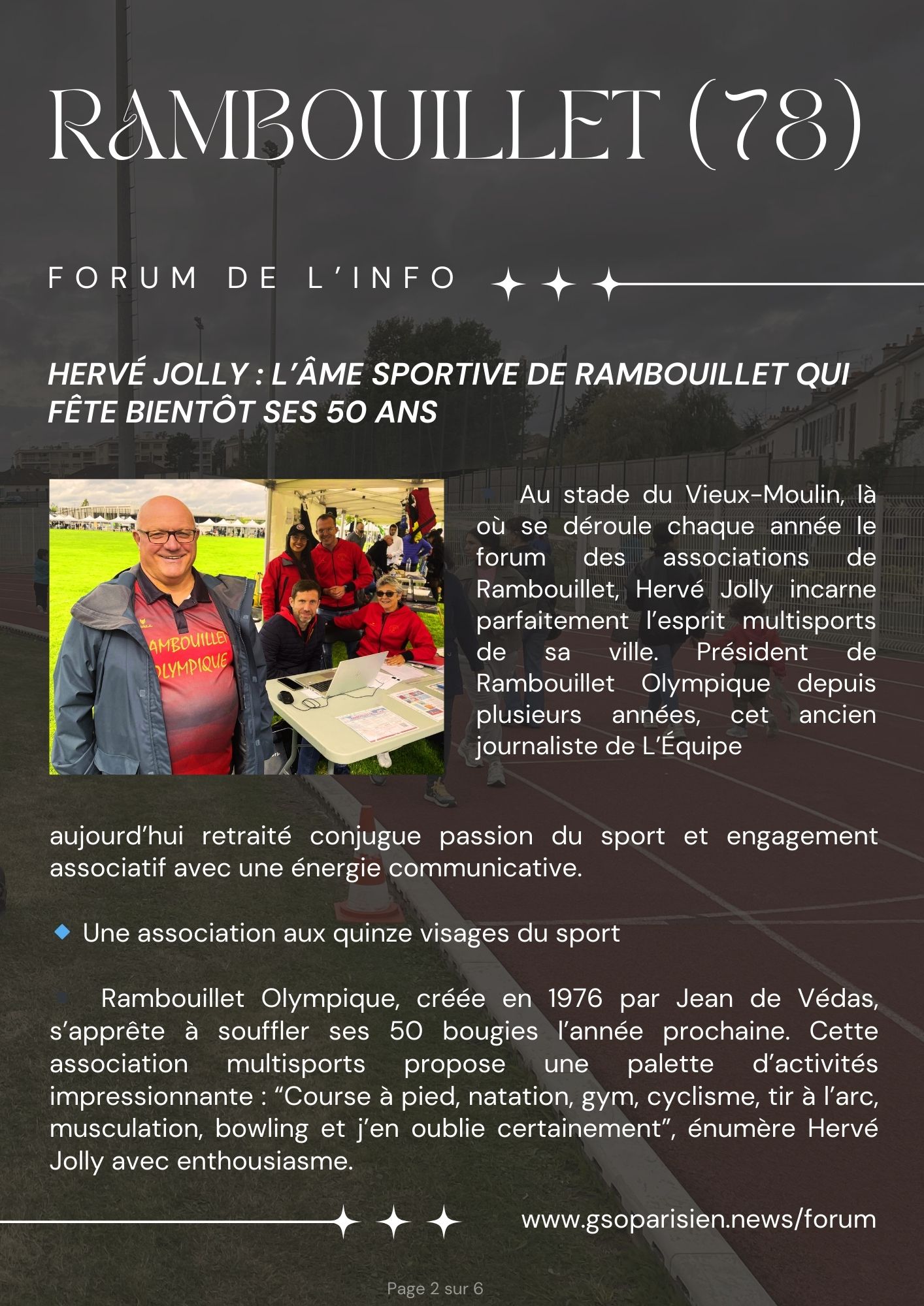 ▪️ Au stade du Vieux-Moulin, là où se déroule chaque année le forum des associations de Rambouillet, Hervé Jolly incarne parfaitement l’esprit multisports de sa ville. Président de Rambouillet Olympique depuis plusieurs années, cet ancien journaliste de L’Équipe aujourd’hui retraité conjugue passion du sport et engagement associatif avec une énergie communicative.