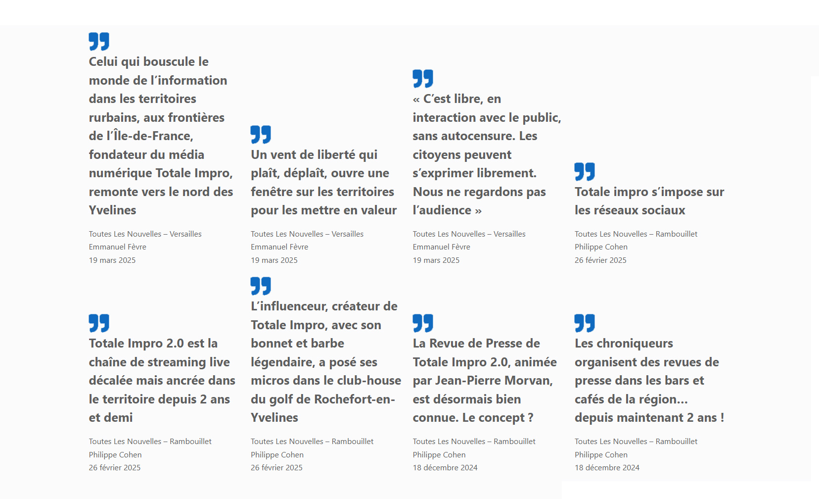 Ce que je revendique avant tout, c’est la liberté de ton. Pas de langue de bois, pas de langue de vipère non plus. Dire les choses, les entendre, parfois déranger, mais toujours dialoguer. C’est cet esprit qui a donné naissance aux revues de presse publiques de Totale Impro 2.0, des émissions en direct, tournées dans des cafés ou sur des terrasses, où le public et les chroniqueurs échangent sans filtre. Une autre manière de faire de l’info : vivante, participative et décomplexée.
