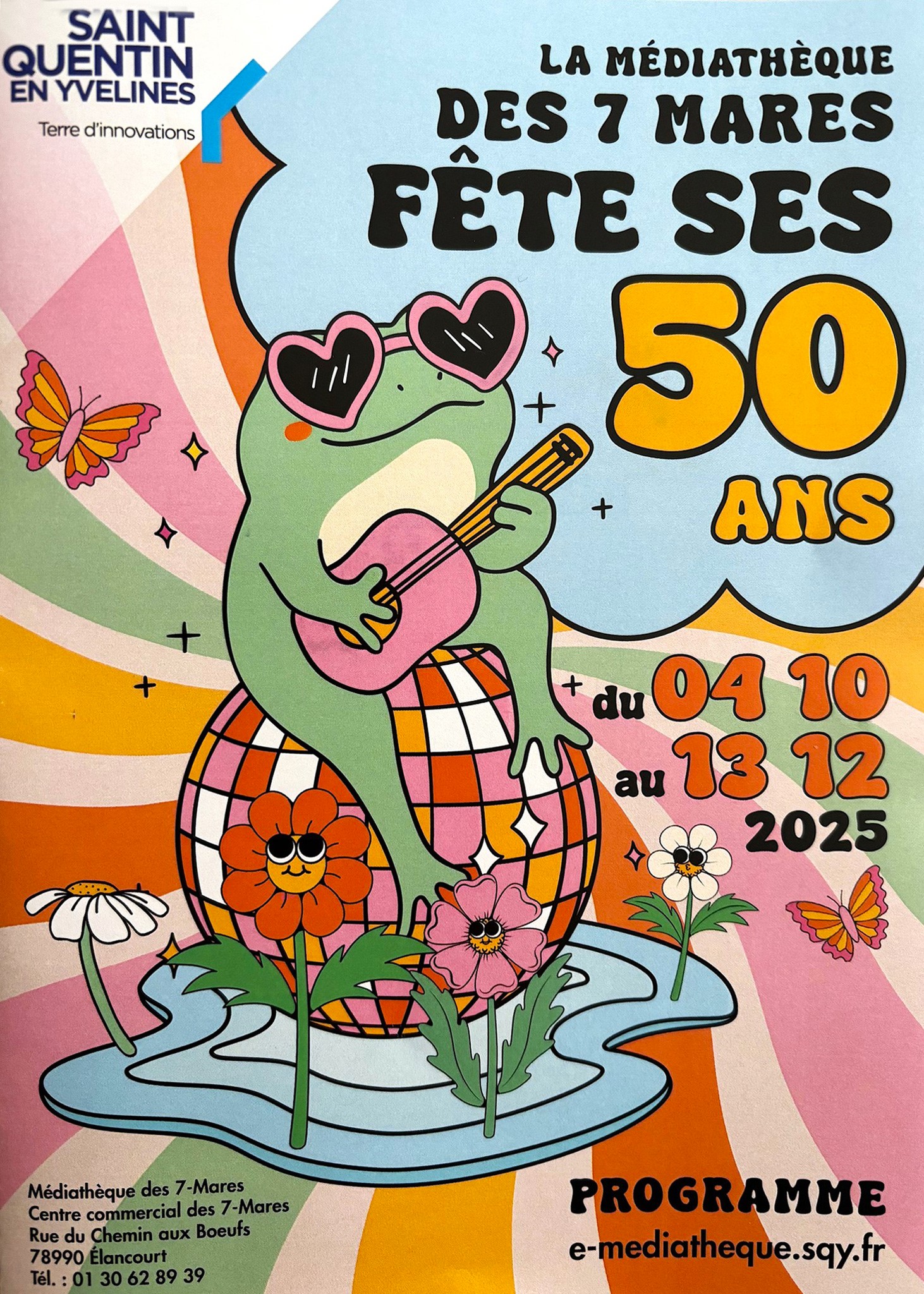 Pour célébrer ce 50e anniversaire, la Médiathèque des 7-Mares propose plusieurs animations jusqu’au 13 décembre : expositions, atelier de masques sur le Carnaval des Ténèbres le samedi 8 novembre et rencontre sur le même thème le samedi 15 novembre, spectacle de danse hip-hop par la Compagnie Iffra Dia (ancien des B3 – Black Blanc Beur) le samedi 9 novembre, concert pop-rock de l’école de musique le 12 décembre, soirée de clôture sur le thème des années 70 le samedi 13 décembre, etc. Le programme complet est sur : https://e-mediatheque.sqy.fr