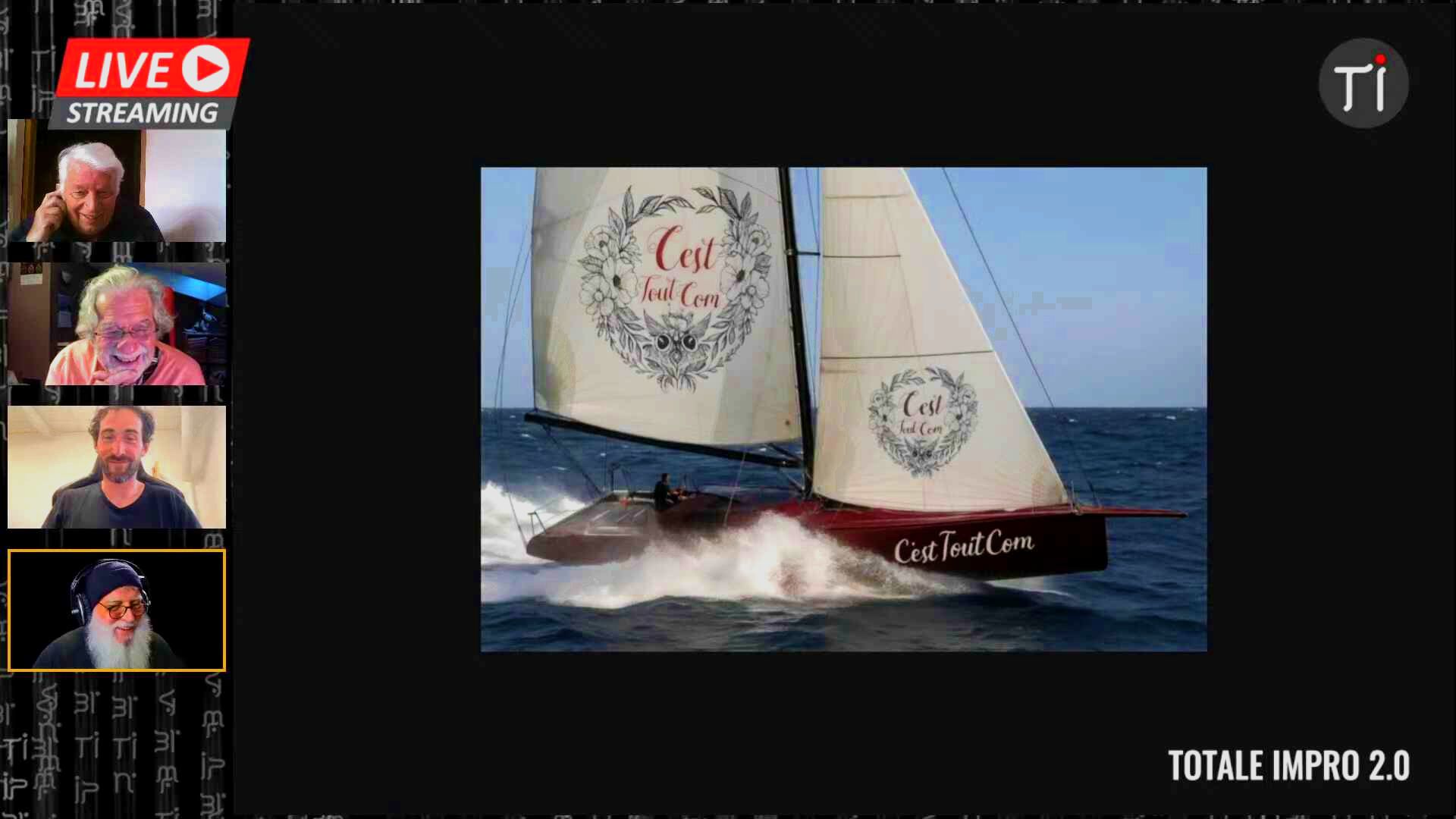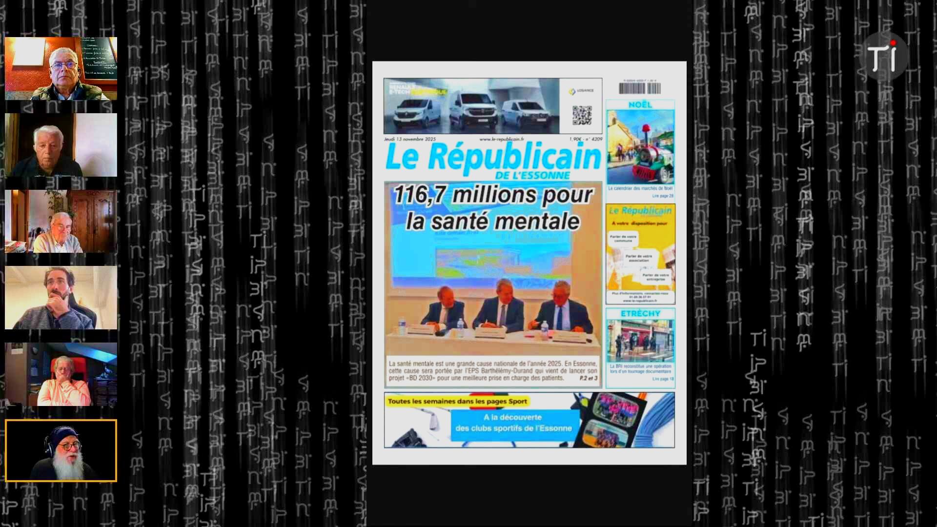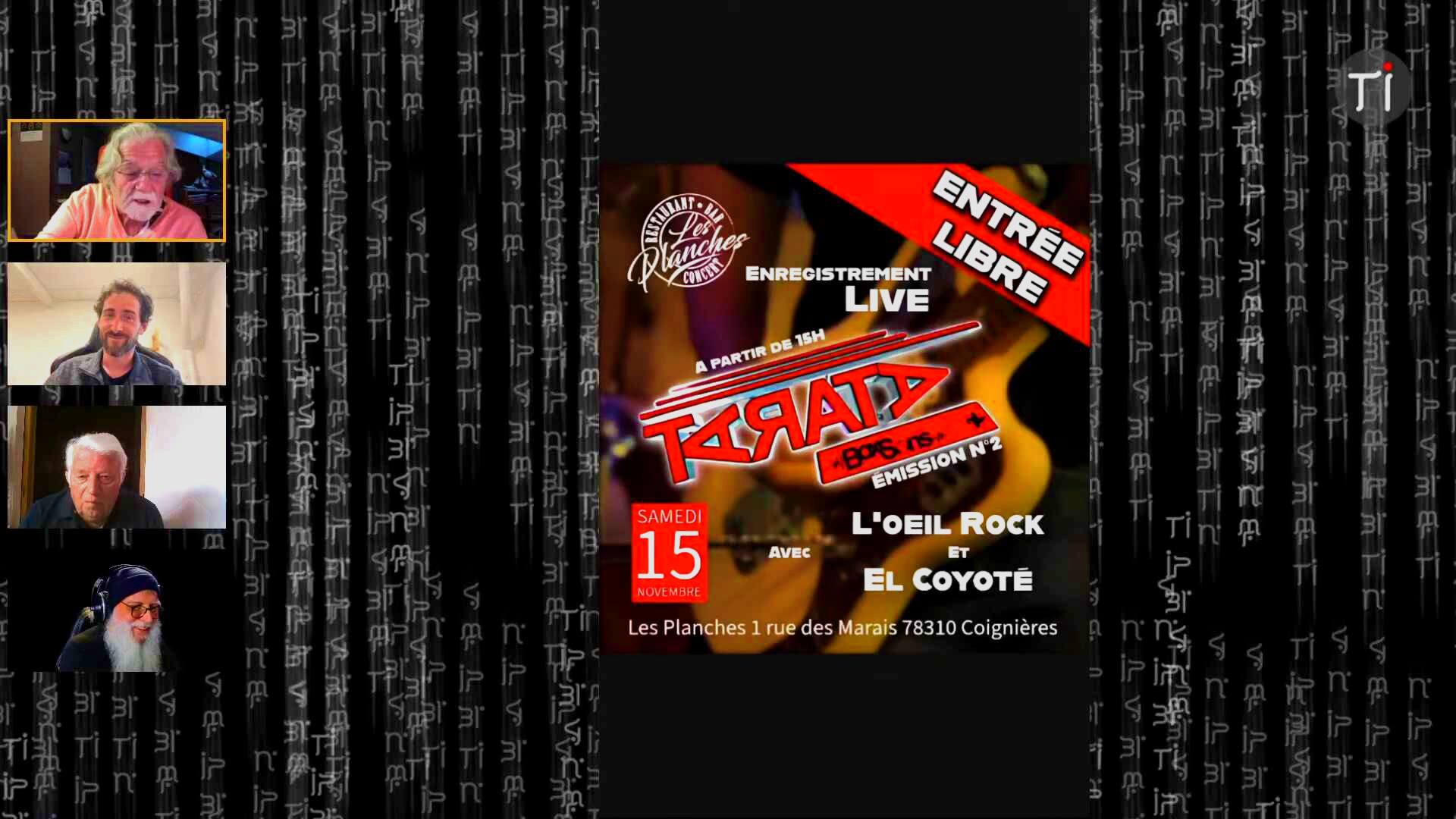 🎤 Totale Impro 2.0 : Société, Voyages et Culture > Ces extraits retranscrivent un segment animé d’un talk-show, intitulé « Talk Show Confluence » sur la chaine de streaming « Totale Impro 2.0 », où plusieurs chroniqueurs et l’animateur, Jean-Pierre Morvan (Yann), discutent de divers sujets d’actualité et de culture. Les participants, dont Kevin Taurin, Michel Cavard, Jean Philippe Gibault et Jean Berny, abordent des thèmes allant de la culture locale dans les Yvelines — notamment la salle de spectacle La Chouette — aux commémorations des attentats du 13 novembre, suscitant des discussions passionnées sur le terrorisme, la propagande et le rôle de l’État. La conversation couvre également une revue de presse régionale et internationale, examinant des sujets comme la hausse des taxes foncières, la politique franco-algérienne, et les implications d’une éventuelle panne d’Internet. Enfin, le chroniqueur Kevin Taurin partage des récits de voyages d’aventure à vélo et en bateau, y compris sa participation à l’ultra-trail la Diagonale des Fous, soulignant l’importance de l’humanité et de la prise de temps face aux défis du monde moderne, incluant les problématiques écologiques discutées lors de la COP 30.