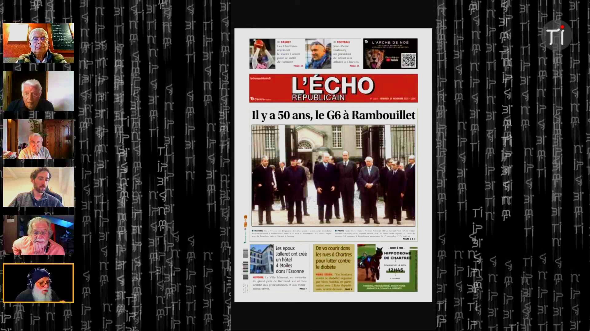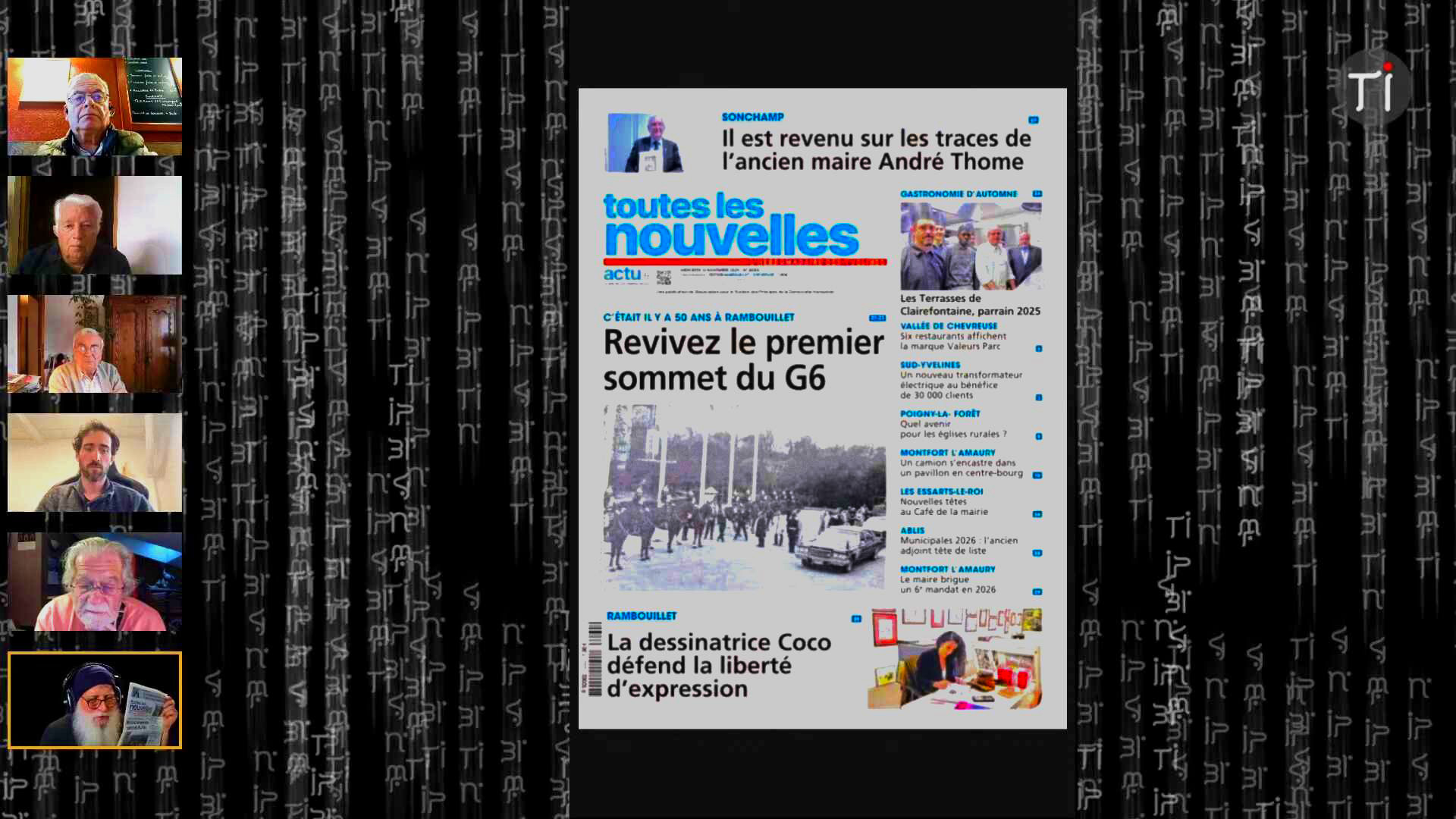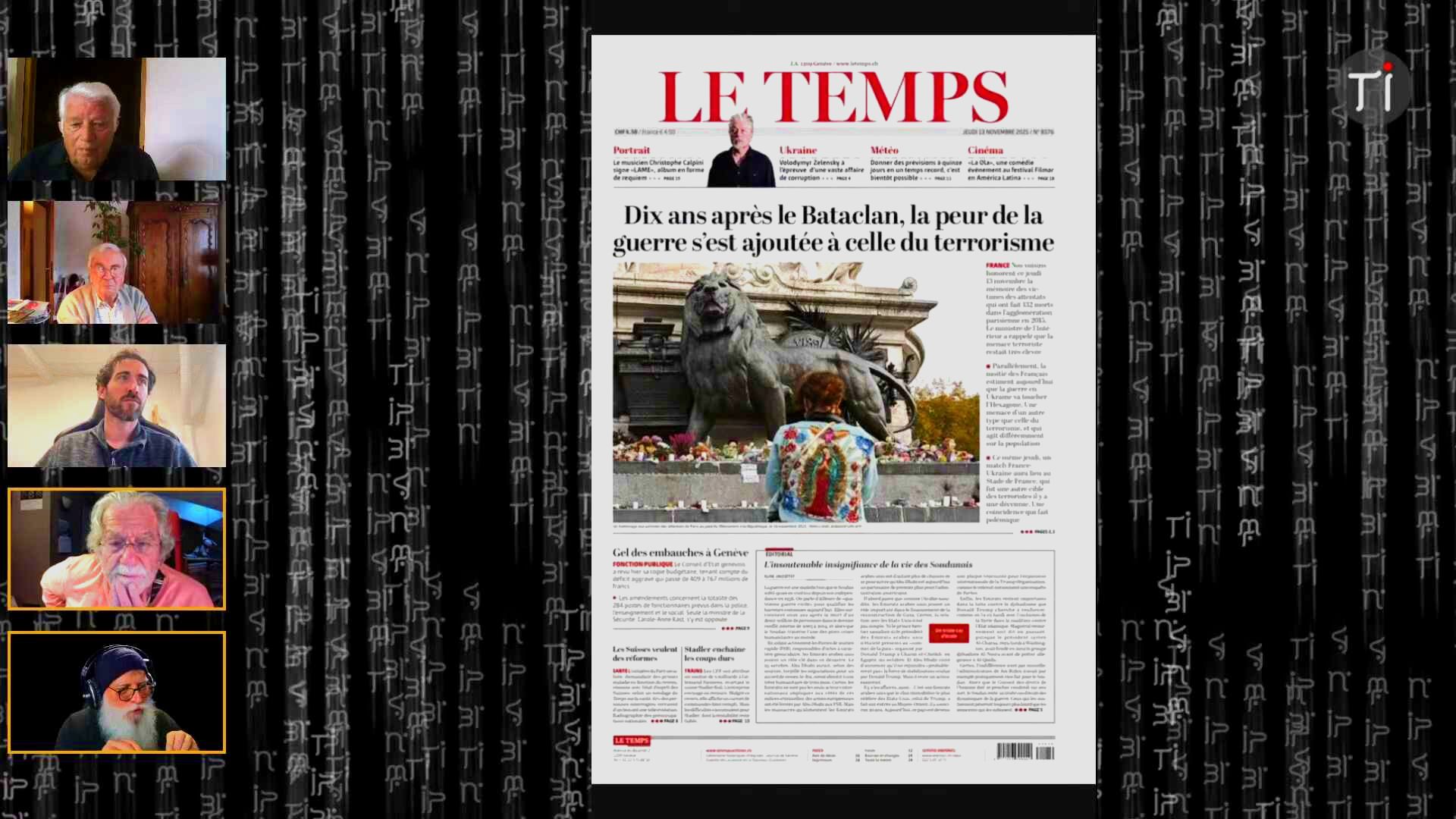 🎤 Totale Impro 2.0 : Société, Voyages et Culture > Ces extraits retranscrivent un segment animé d’un talk-show, intitulé « Talk Show Confluence » sur la chaine de streaming « Totale Impro 2.0 », où plusieurs chroniqueurs et l’animateur, Jean-Pierre Morvan (Yann), discutent de divers sujets d’actualité et de culture. Les participants, dont Kevin Taurin, Michel Cavard, Jean Philippe Gibault et Jean Berny, abordent des thèmes allant de la culture locale dans les Yvelines — notamment la salle de spectacle La Chouette — aux commémorations des attentats du 13 novembre, suscitant des discussions passionnées sur le terrorisme, la propagande et le rôle de l’État. La conversation couvre également une revue de presse régionale et internationale, examinant des sujets comme la hausse des taxes foncières, la politique franco-algérienne, et les implications d’une éventuelle panne d’Internet. Enfin, le chroniqueur Kevin Taurin partage des récits de voyages d’aventure à vélo et en bateau, y compris sa participation à l’ultra-trail la Diagonale des Fous, soulignant l’importance de l’humanité et de la prise de temps face aux défis du monde moderne, incluant les problématiques écologiques discutées lors de la COP 30.
