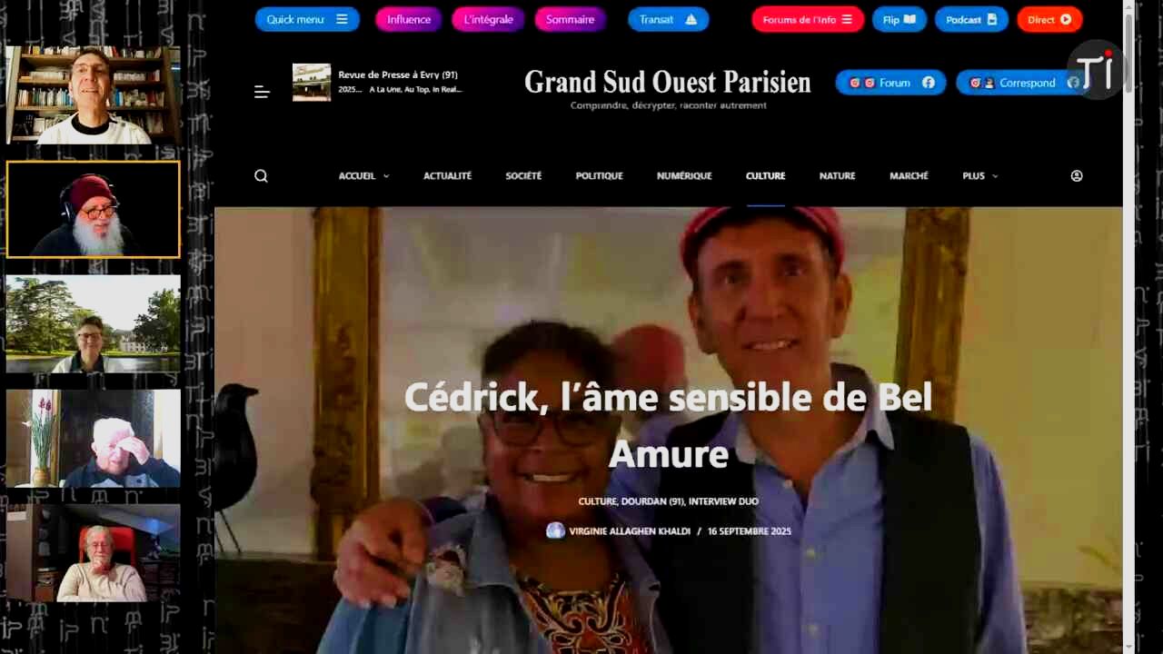 🎤 Émission Talk Show Confluence : golf, culture et de revue médias > “Talk Show Confluence” de la chaîne “Totale Impro 2.0”, impliquant plusieurs animateurs et chroniqueurs, dont Jean-Pierre Morvan (Yann) et Michel Cavard. Une partie importante de la discussion est consacrée à l’interview de l’invité Cédrick Samiez, du groupe de musique celtique “Bel Amure”, où il partage son expérience de marin, son attachement à la musique populaire et l’impact émotionnel de leurs performances. De plus, les participants abordent une revue de presse couvrant des sujets variés allant de la sécurité routière aux Sables d’Olonne à des analyses internationales du journal Courrier International, et incluent également des chroniques sur le patrimoine des Yvelines et le golf. L’émission se termine par un point sur une course virtuelle en cours et par le traditionnel questionnaire de Bernard Pivot posé à l’invité.