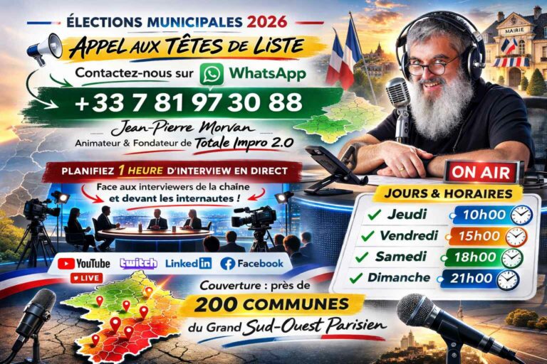 🎙️ Élections Municipales 2026 – Totale Impro 2.0 ouvre ses antennes aux têtes de liste ! Vous êtes candidat(e) tête de liste aux Élections Municipales 2026 ? Faites entendre votre voix, défendez votre projet, et rencontrez directement les citoyens de…